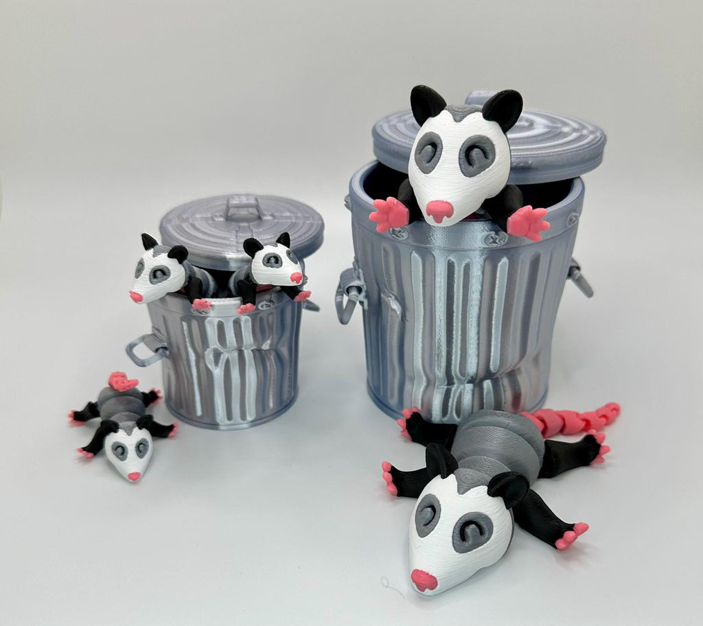 We have several sizes available, and you can choose from the adorable baby/small possum or a large possum. Each realistic looking dented trash can comes with its own "trash" consisting of the same 3D printing material used in making the possums.